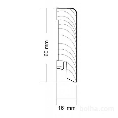 MDF zaključna letvica za parket, model FR60x16mm, belo barvana (na zalogi tudi surova ki se lahko naolji). Možnost nevidnega pritrjevanja z nosilci (cena 0,25€/kom, poraba 4kom/tm).