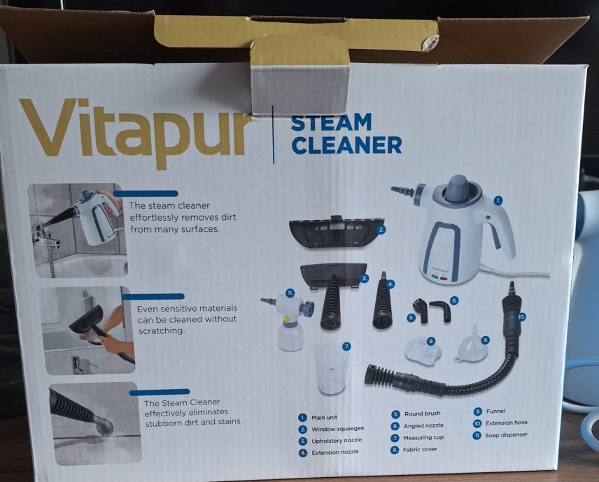 Parni čistilnik Vitapur izkorišča naravno moč pare. Priloženi so različni nastavki, ki bodo pomagali pri spoprijemanju s specifičnimi nalogami pri čiščenju. Rabljen je bil le dvakrat. Cena novega je 64€. Možen osebni prevzem v Mariboru, v kolikor pošljem po pošti, zaračunam še stroške pošiljanja. Info 040 722 950.
