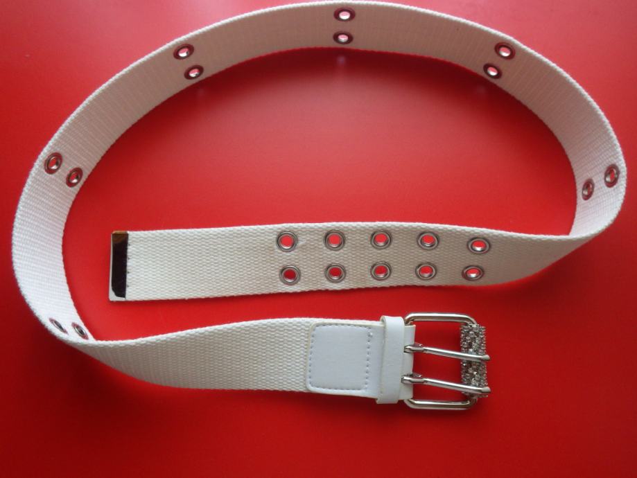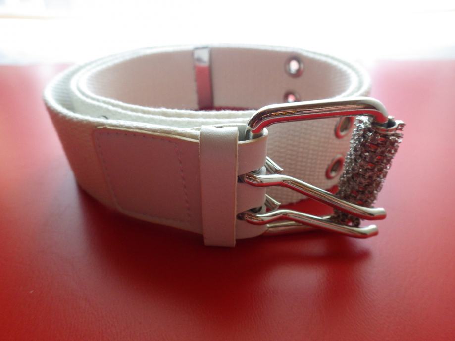 Dekliški pas, platnen, širina 4 cm, dolžina 90 cm, bel s kristalčki na zaponki, nerabljen.