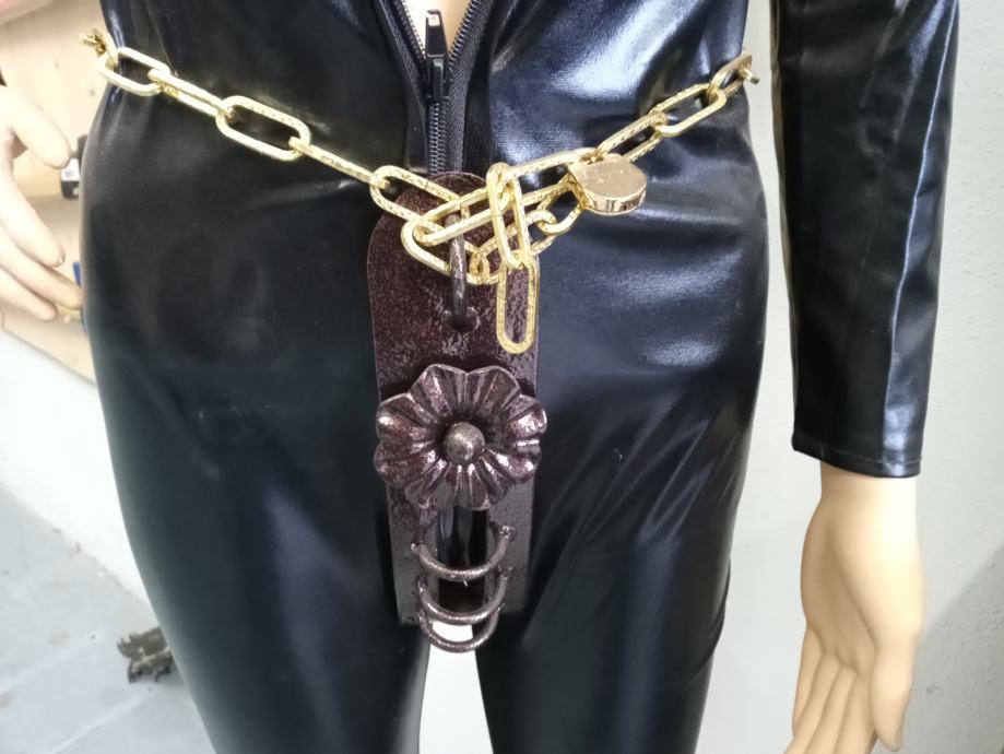 Deviški pas iz kovanega železa prašno barvan v bakreni barvi zaklepanje na ključavnico dolžina verige okoli pasu do 120 cm