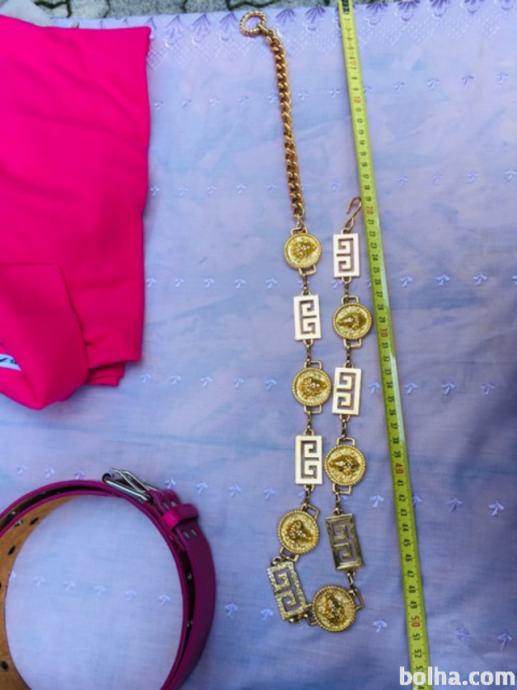 Kovinski ženski pas z vgraviranimi levjimi glavami - design Versace. Dolžina cca 80 cm.