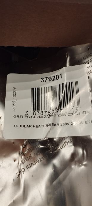 Prodam povsem nov grelec za ventilatorski del pečice Gorenje. Št. rezervnega dela 379201. Možnost vgradnje v več tipov pečic Gorenje. Prodajam, ker sem menil, da je stari grelec pokvarjen, vendar je bila napaka drugje in pečice ni več imelo smisla popravljati. Zraven priložim še enak popolnoma delujoč rabljen grelec, ki je bil vgrajen v model B8980S, art. št. 695214.