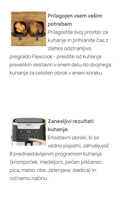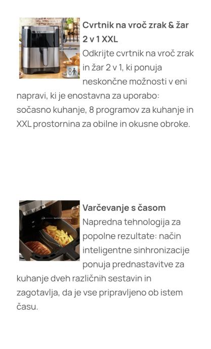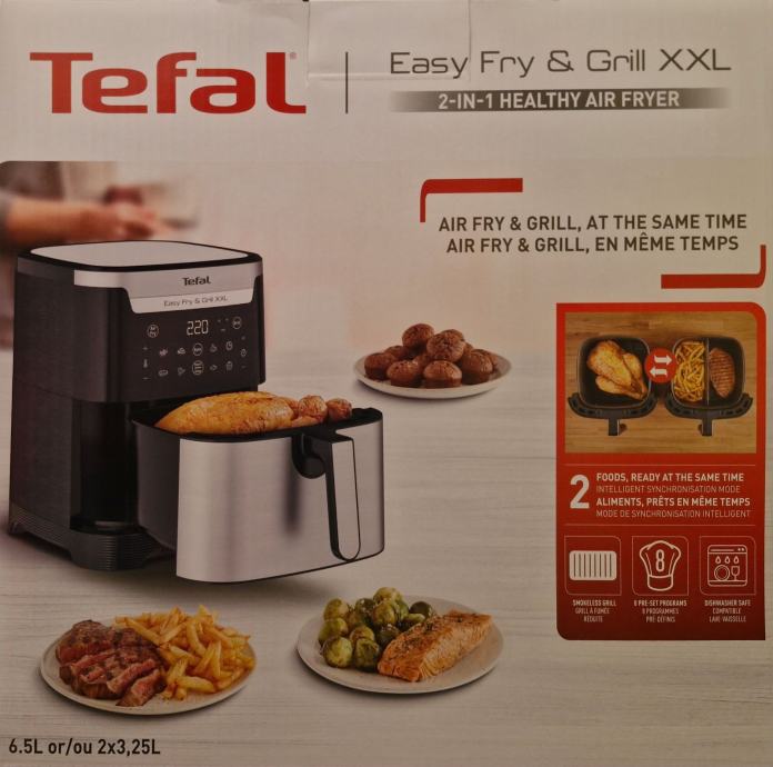 Novo. S cvrtnikom na vroč zrak in žarom 2 v 1 Tefal Easy Fry Grill XXL navdušite družino z okusnimi in zdravimi obroki iz lastne kuhinje. Z odstranljivo pregrado Flexcook lahko preprosto preklopite z zmogljivosti XXL, ki postreže do 8 oseb, na dve coni za peko dveh različnih jedi, ki bosta pripravljeni hkrati.