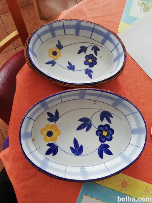 Pekač. Pekači. Komplet dveh pekačev belo-modre barve. Oba pekača sta v leseni košarici. Mere večjega pekača ca23,5 x 23 x 6 cm , mere manjšega . pekača 27,5 x 19,5 x 5,5 cm. Komplet 10 €, posamezno 6 € kom