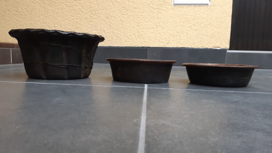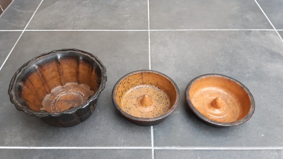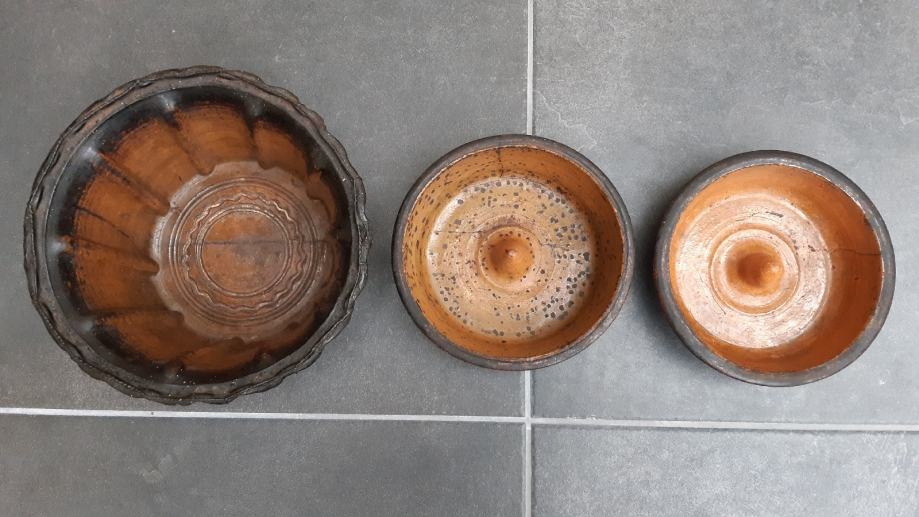Zaradi neuporabe prodam tri glinene posode za peko šarkljev.Premer zgoraj 29 cm,višina 14 cm-25€,premer zgoraj 22 cm,višina 6 cm-10€(2 kom).Velika posoda je bila že tovarniško ovita z žico.Če vzameš vse tri,je cena 35€.Pošljem po ceniku Pošte Slovenije.