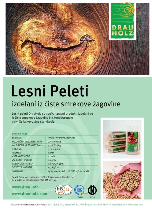 Peleti DrauHolz so avstrijsko certificirani peleti. Izdelani so iz 100% smrekove surovine in brez lubja. So brez kemičnih dodatkov. Imajo pridobljen mednarodni certifikat ENPlus A1 in DINplus.