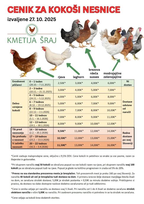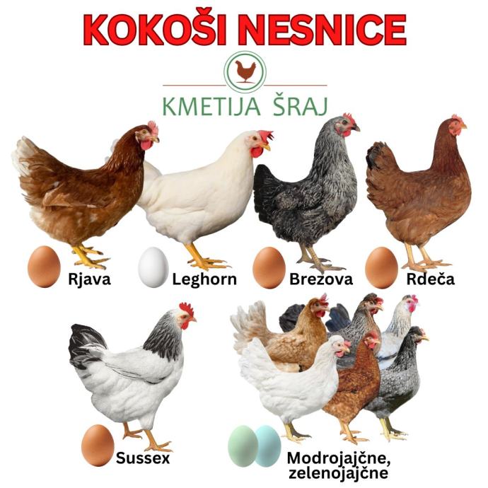Na Kmetiji Šraj bomo od 2.2.2026 prodajali naslednjo jato kokoši nesnic. Na voljo bodo zelo različne pasme. Naše kokoši so zelo trpežne in primerne za rejo v zelo raznolikih okoljih. Imajo dobro sposobnost prilagajanja različnim pogojem. Izvaljene so bile 27.10.2025 in bodo z nesnostjo začele v začeteku marca.
