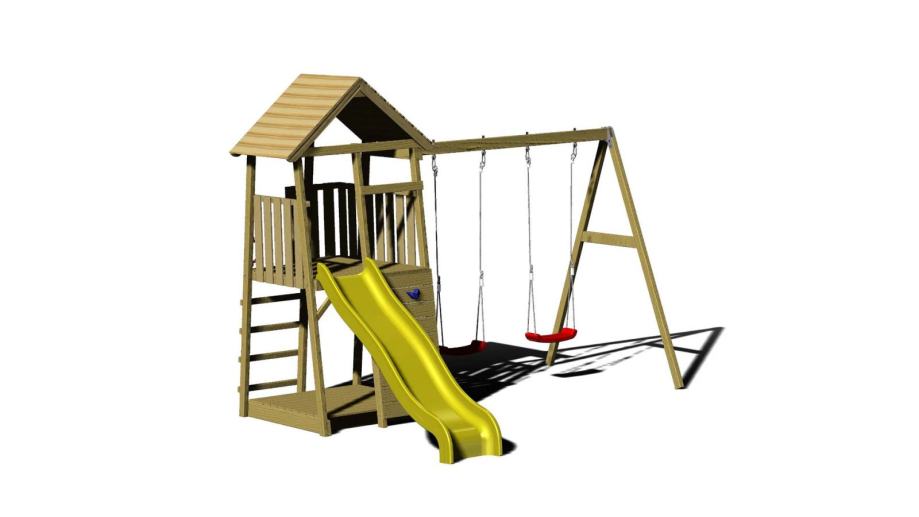 Pod stolpom je vgrajen peskovnik s pokrovi, ki jih je mogoče zapreti po igri, da ostane pesek suh in čist. Dodatno zabavo in odmerek adrenalina nudijo dvojne gugalnice, pritrjene ob strani stolpa.
