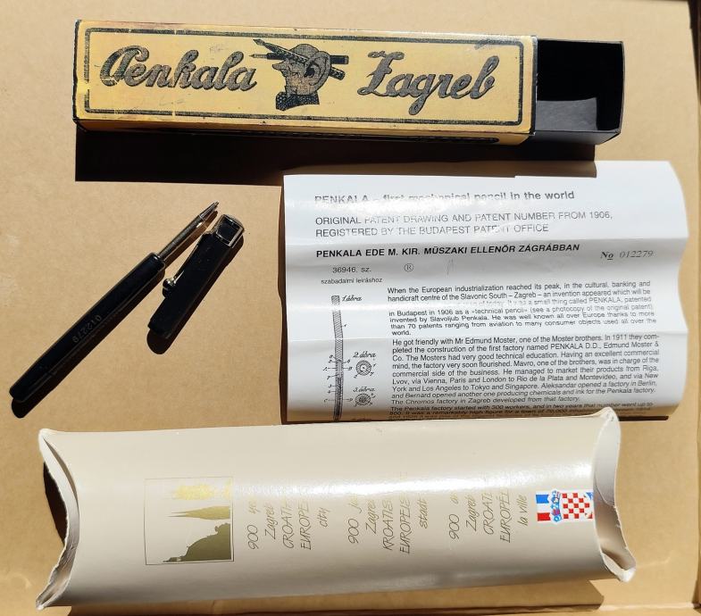 Naprodaj replika/suvenir prvega tehničnega svinčnika na svetu – Penkala. Izumil ga je Hrvat Eduard Slavoljub Penkala l. 1906, na njem je odtisnjen originalen žig. Svinčnik je v reprintu škatlice iz l. 1912., s certifikatom, ki vsebuje načrt svinčnika in kratko zgodovino tovarne. Ta primerek je bil v posebni izdaji in omejeni količini naprodaj ob 900 letnici Zagreba. Cena 20€.