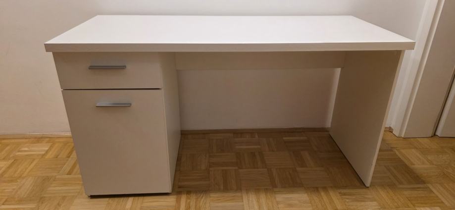 Prodam belo pisalno mizo 140cm x 60cm. Višina zgornji rob 77 cm. Predal in omarica z eno polico.