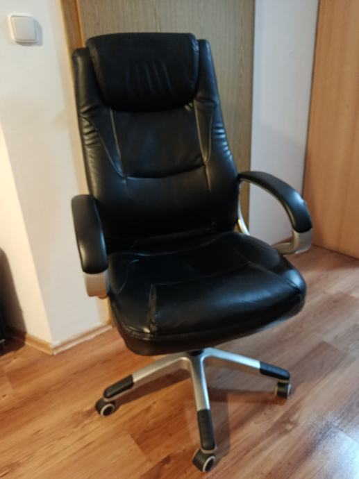 Prodam črn oblazinjen stol s prilagodljivo višino, nagibom na koleščkih. Funkcijsko je povsem OK, le na levem ročaju je malenkost podrsan in je blago malo potrgano (stol je bil neposredno ob steni, poškodba je vidna na zadnji sliki). Primeren je tudi za gejmerje.