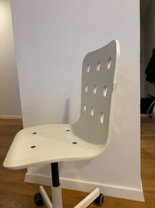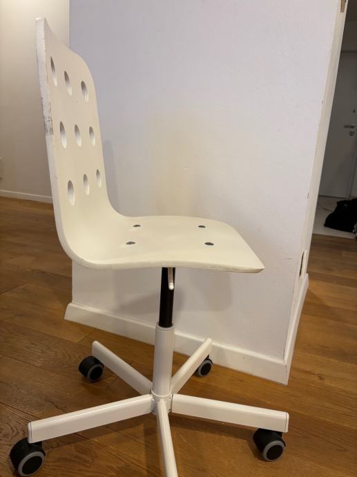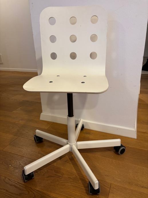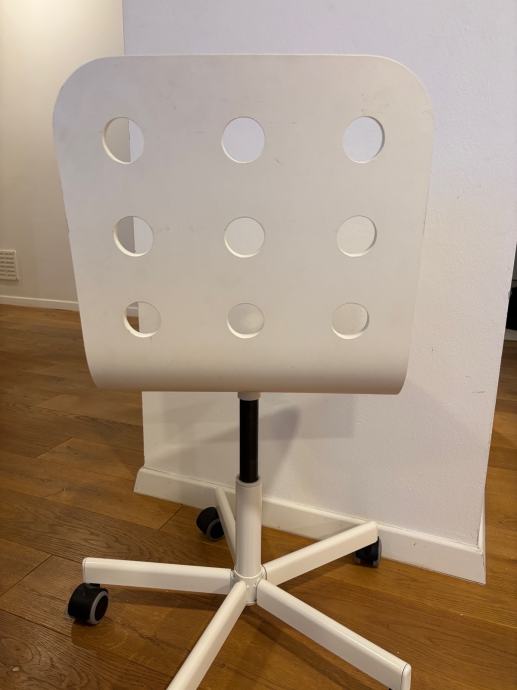 Prodajam rabljen Ikea Jules otroški vrtljiv stol v beli barvi, ki je idealen za pisalno mizo v otroški sobi. Stol ima luknjičasto naslonjalo, je prilagodljiv po višini in ima kolesca za lažje premikanje.