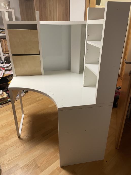 Prodajam rabljeni kotni pisalno mizo ikea Micke. Je rabljena vec let zato je stanje taksno kot je, a je se vedno povsem super in funkcionalna. Stanje je vidno na fotografijah, nic zlomljeno so pa vidni znaki uporabe.