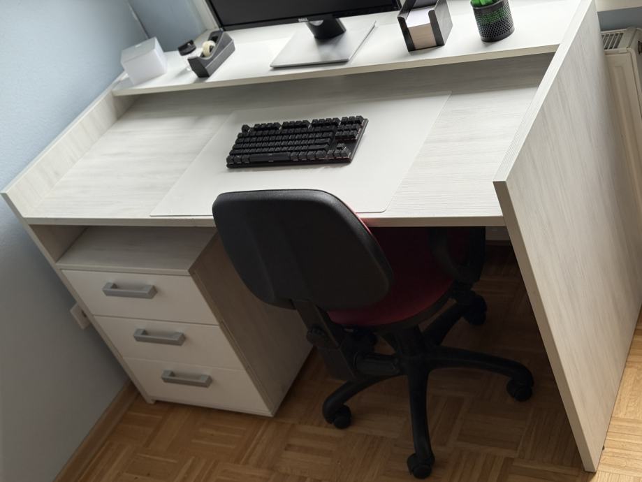 Prodamo mladinsko sobo, mizo in predalnik, nastavljiv stol po višini in naklonu, tro-delna omara.