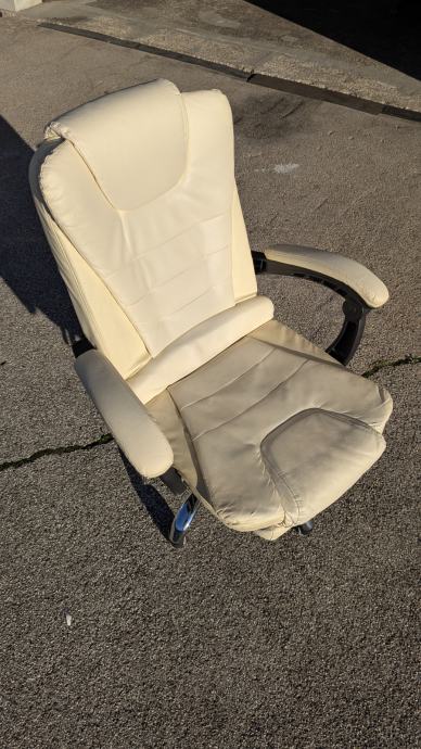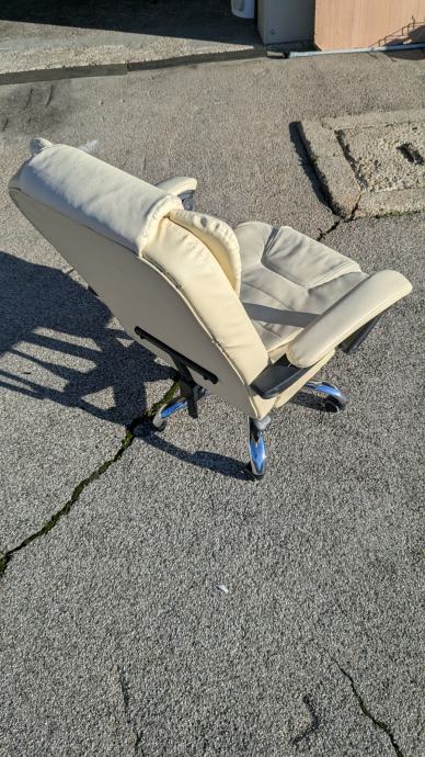 - SPECIFIKACIJA – barva materiala: krem; material: eko usnje; osnova: kromirano jeklo; kolesa: guma; mehanizem: vzvod (metulj); največja obremenitev: do 130 kg; opora za noge: 38 x 22 cm; sedež: 51 x 46 cm; naslonjalo: 66 x 50 cm; višina: 102-110 cm; teža fotelja: 17,3 kg