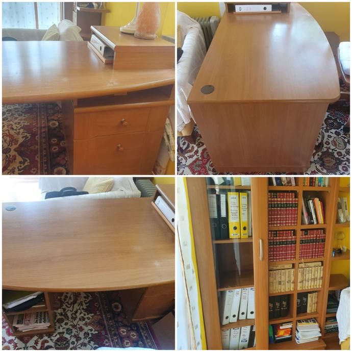 Za simbolično ceno prodamo pisalno mizo 150 x 80 cm in Knjižni regal z zaprto stekleno vitrino in odprtimi policami 150 cm širine , globina 30 cm in vitrina 45 cm, višina 200 cm. Oboje v barvi lesa.