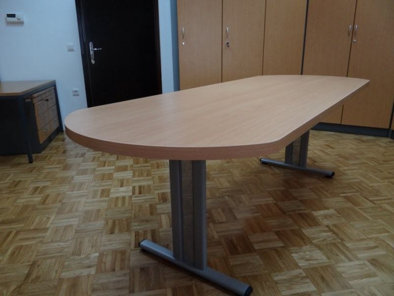 Pisalna miza, postavljena na dveh stabilnih nosilcih (glej drugo sliko) z sredinskim delom za morebitne instalacije, kable, vtičnice,.... lepo ohranjeno, prodam.