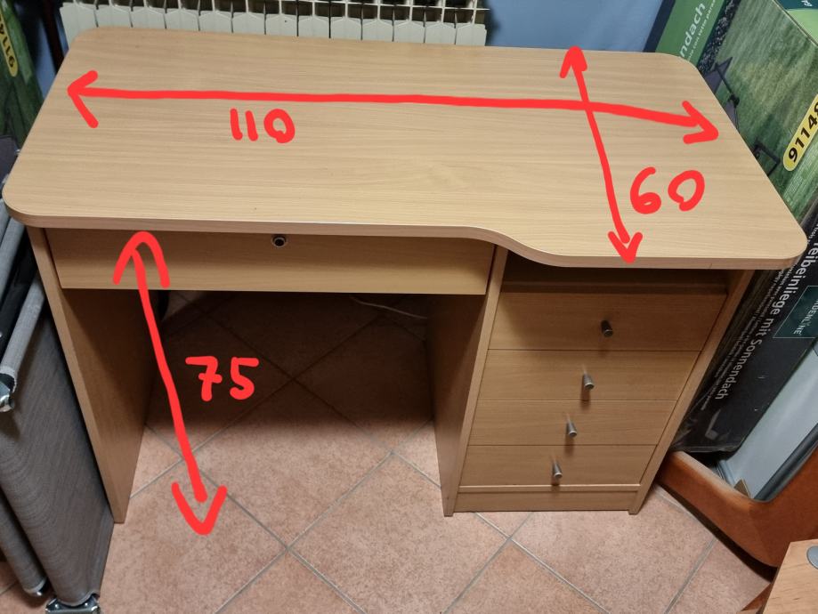 Ima en večji predal na sredini, desno ena odprta polica in 4 predali.
