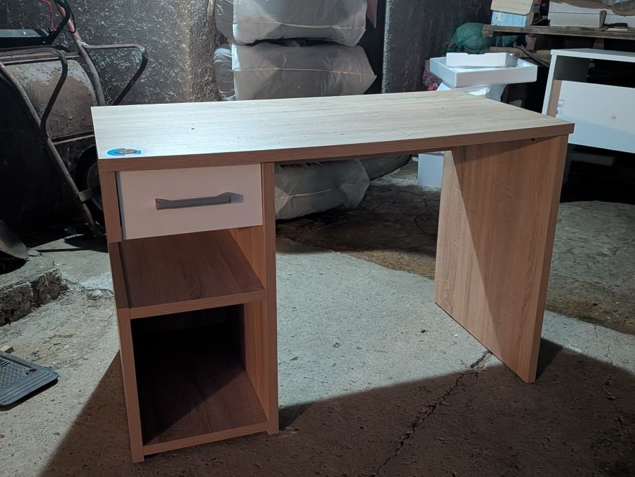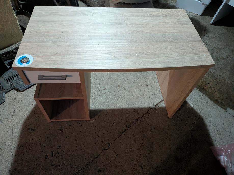 Pisalna miza z enim predalom in dvema odprtima policama. Svetel hrastov videz, stabilna in primerna za manjše prostore. Rabljena, z običajnimi znaki uporabe.