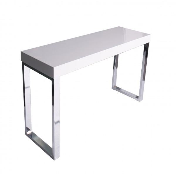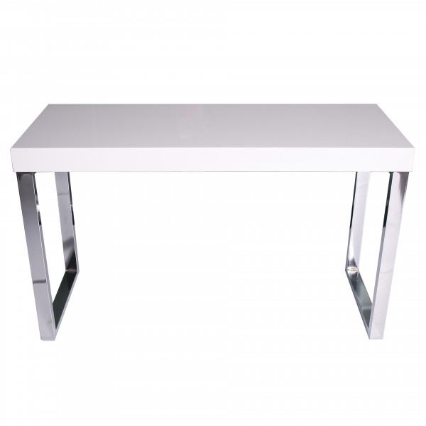 Preprosta pisarniška miza v kombinaciji kromastega kovinskega okvirja in MDF plošče, lakiran v beli barvi