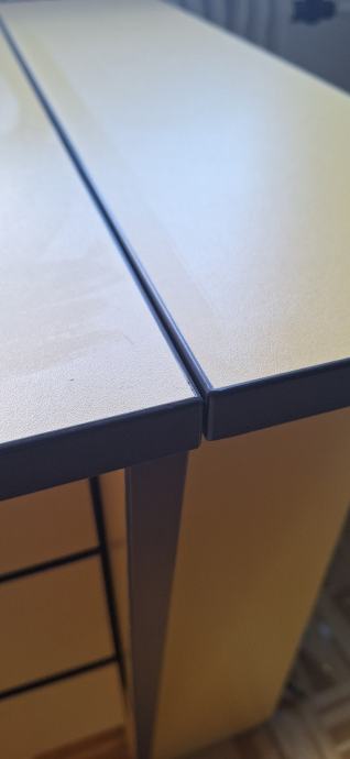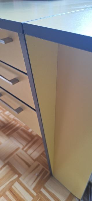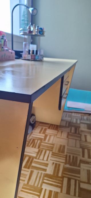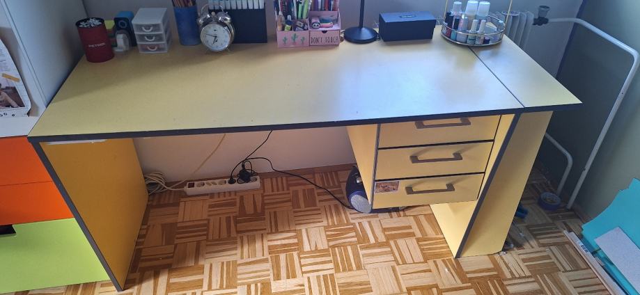 Prodam pisalno mizo s tremi predali pod mizo in enim vgrajenim v zgornjo ploskev mize. Miza je bila izdelana po naročilu pri mizarju in je kompaktne izvedbe. Dimenzije mize: 144x60x75cm. Dimenzina predalov (notranjost): 30x43x8cm. Namizni predal: 46x15x9cm. Miza ima na zgornji ploskvi tudi okroglo režo za kable. Hrbet je enake debeline kot stranice.