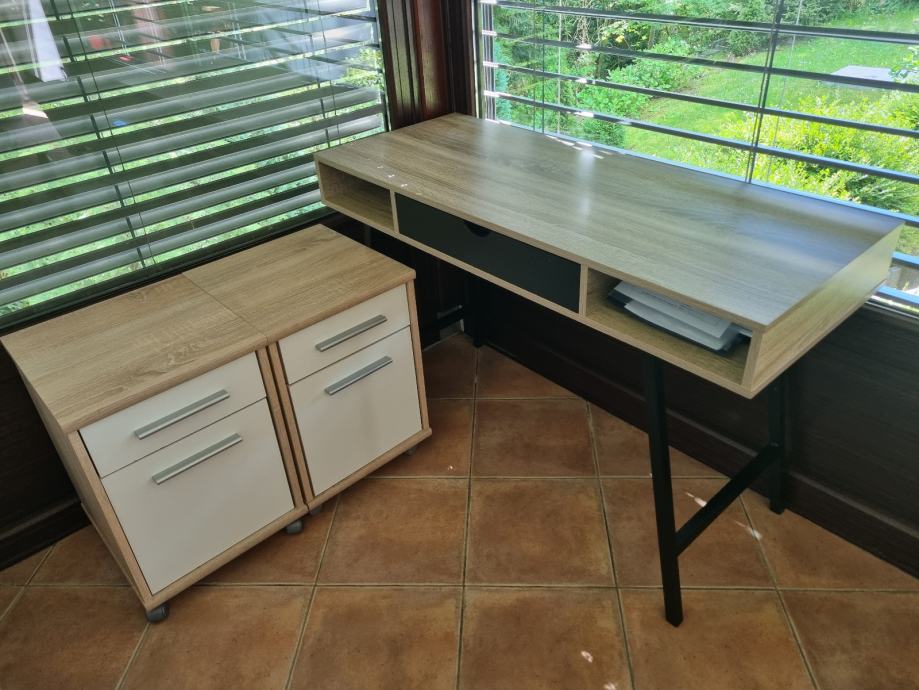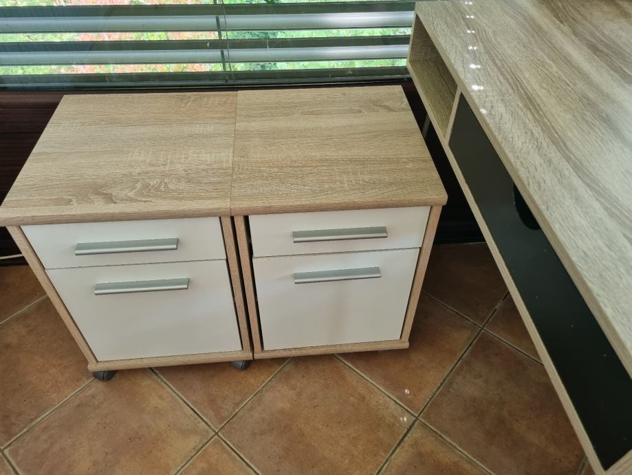 Prodam pisalno mizo velikosti 120x48x76 cm (d,š,v) ter dva predalnika oziroma omarici na kolesih velikosti 39x42x56 cm vsaka (dxšxv).