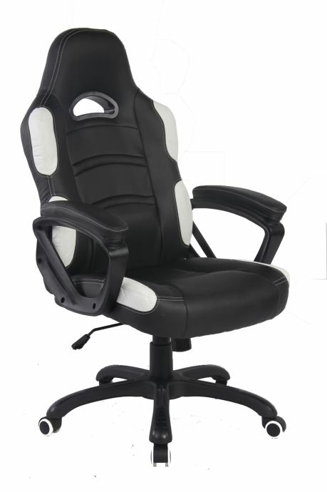 Pisarniški stol iz umetnega usnja v črni barvi s kombinacijo bele barve. Stol je vrtljiv in nastavljiv po višini. Višina sedišča je 42-49 cm. Rokonasloni so po vrhu oblazinjeni. Podnožje je v črni barvi s gumiranimi kolesci.