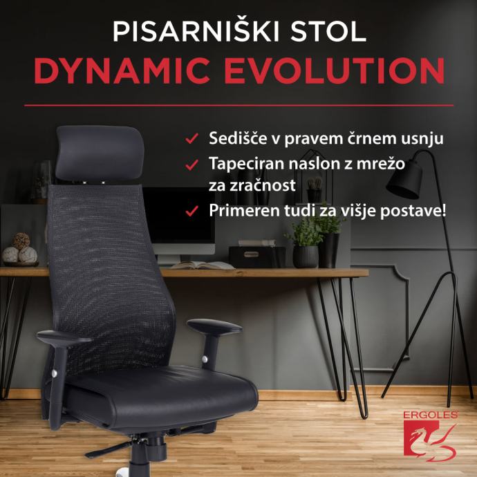 Pisarniški stol Dynamic je rezultat Ergolesovega razvoja in je že več kot deset let eden izmed paradnih konjev med pisarniškimi stoli. Odlikuje ga močna konstrukcija, kakovosten mehanizem in popolna nastavljivost ročnih opiral. Sedežni del z dodatno nastavitvijo globinskega premikanja sedeža omogoča prijetno ter udobno sedenje, povišan naslon s posebej poudarjeno ledveno oporo za maksimalen oprijem hrbta zagotavlja pravilno ergonomsko sedenje, nastavljiv vzglavnik omogoča prijeten oprijem vratu ter glave, 4D nastavljiva ročna opirala pa poskrbijo, da so vaše roke primerno podprte med delom. Kot vzorčen primer odlične kvalitete ter ergonomije je bil stol predstavljen tudi na Bienalu industrijskega oblikovanja v Ljubljani.