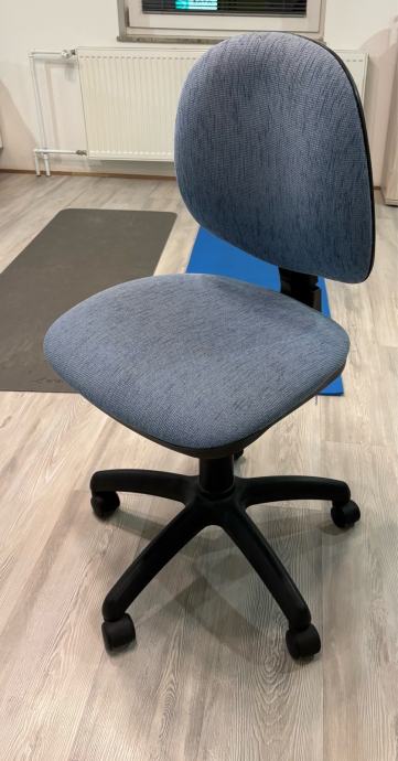 Prodaja se preprost in udoben pisarniški stol z modrim oblazinjenjem in stabilnim 5-krakim podnožjem na kolesih. Stol je primeren za delo za računalnikom, učenje ali splošno uporabo. Višina je nastavljiva, sedež in naslonjalo pa sta mehka in prijetna za sedenje.