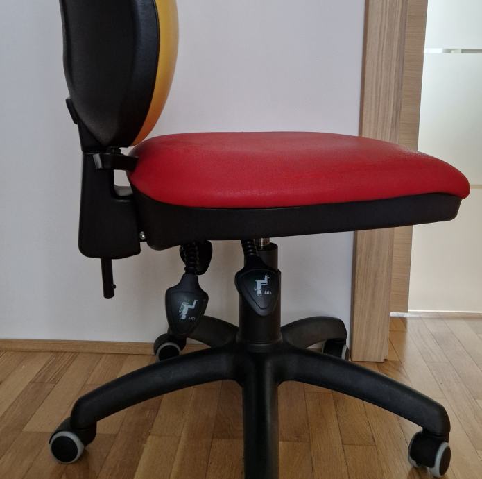 Prodam vrtljiv otroški pisarniški stol Pivk, nastavljiv po višini, nagibu in naslonjalu. Umetno usnje.