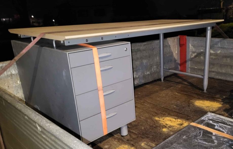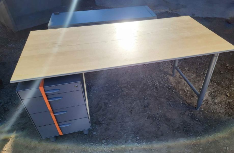 Robustna pisalna miza s kovinskim predalnikom. Dobro ohranjena. Lahko je jo enostavno predela v delavniški pult.