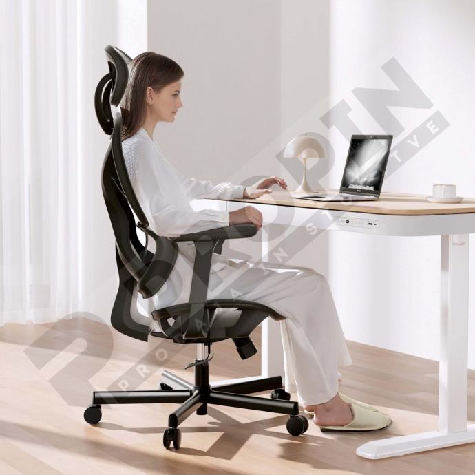 Naslonjalo je prekrito z zračno mrežico, ki omogoča kroženje zraka in poleti preprečuje kopičenje toplote na hrbtu. Da se pisarniški stol prilagodi osebi, ki sedi na stolu, lahko oba naslona za roke nastavite po višini in položaju ter tako zmanjšate utrujenost njenih rok. Prevlečena sta s sintetičnim usnjem in prispevata h kakovostnemu videzu sedeža. Poleg tega je pisarniški stol opremljen s pnevmatsko nastavljivo višino, ki uporabniku omogoča spreminjanje višine v razponu od 116 do 124 cm.