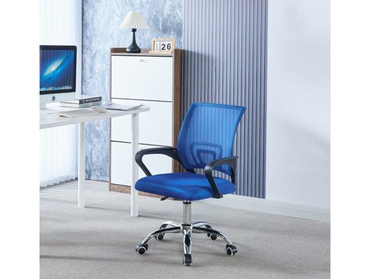 Pisarniški stol DISCO krom/moder je vrtljiv stol, ki je nastavljiv po višini. Zagotavlja popolnoma zanesljivo uporabo ter vzdržljivost. Čvrsta podlaga in zračno mrežasto hrbtišče vam nudita udobje med celotnim delovnim časom. Naslon za hrbet je narejen iz mreže, podnožje je kovinsko.