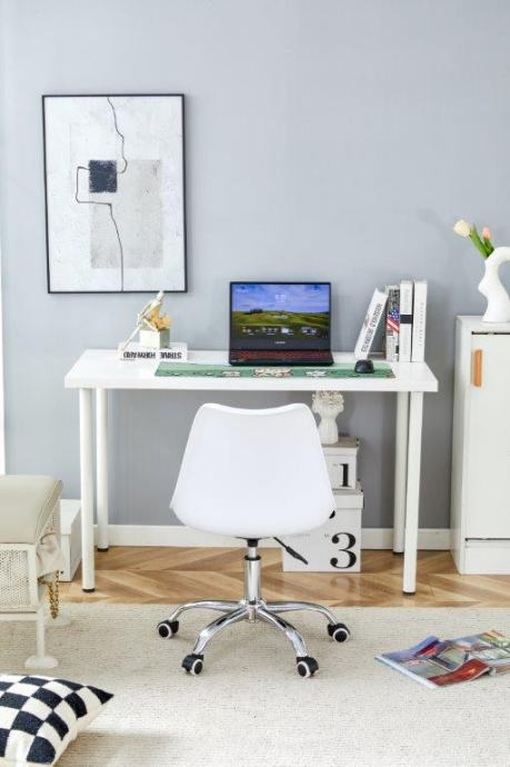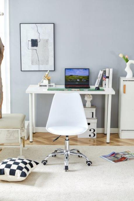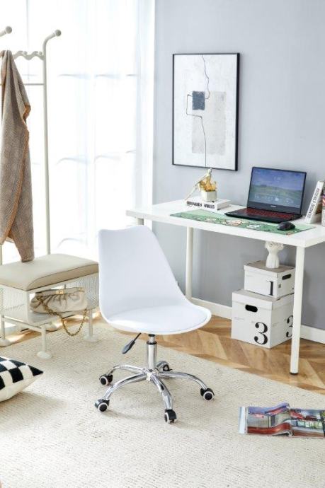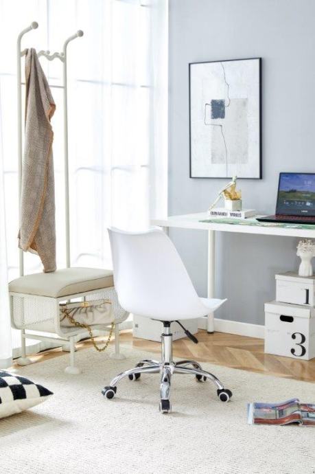 Pisarniški stol ROBI v beli barvi je udoben ter elegantnega videza. Stol je vrtljiv ter nastavljiv na višino. Naslon za hrbet je iz plastike, sedalni del je prav tako iz plastike ter oblazinjen z umetnim usnjem. Podnožje je iz kromirane kovine s plastičnimi koleščki.