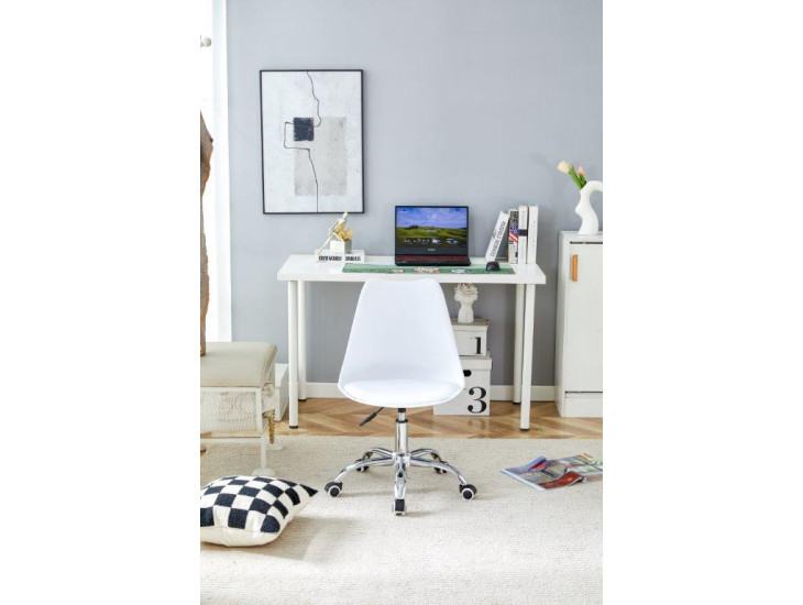 Pisarniški stol ROBI v beli barvi je udoben ter elegantnega videza. Stol je vrtljiv ter nastavljiv na višino. Naslon za hrbet je iz plastike, sedalni del je prav tako iz plastike ter oblazinjen z umetnim usnjem. Podnožje je iz kromirane kovine s plastičnimi koleščki.