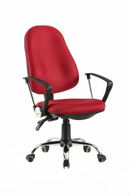Pisarniški stol Simon, z nastavljivo višino in nagibom naslonjala za udobno delo pri pisalni mizi ali delo z računalnikom. Oblazinjen je v tkanino v bordo rdeči barvi. Podnožje je kovinsko - kromirano.