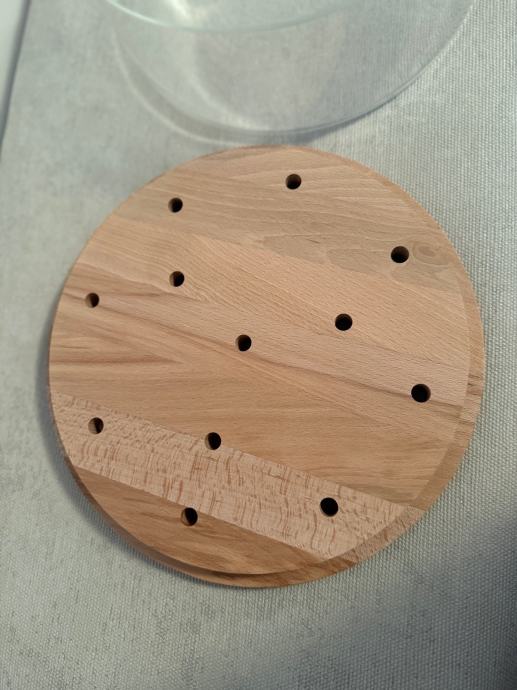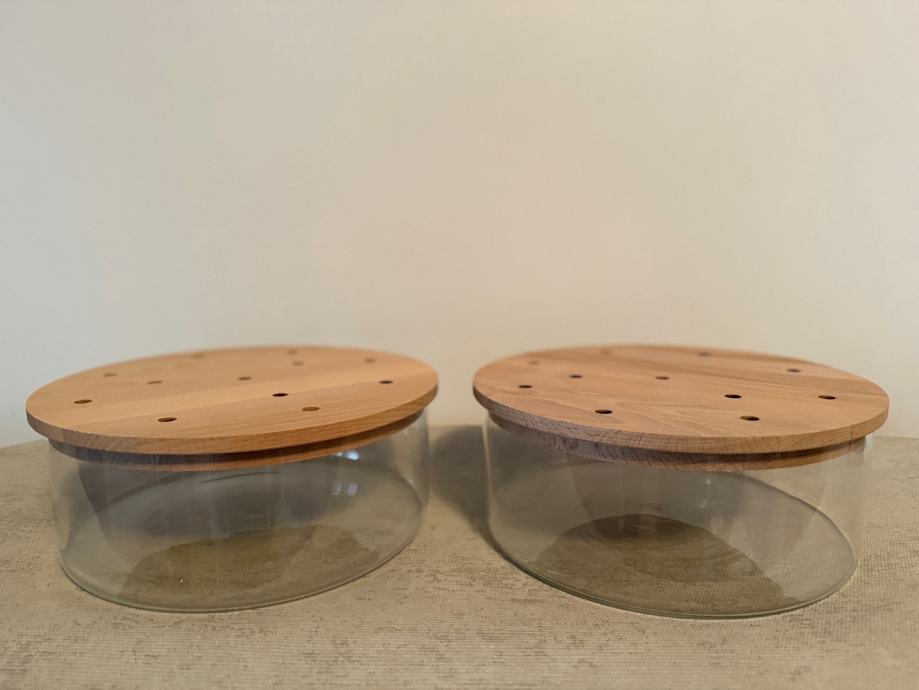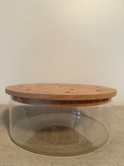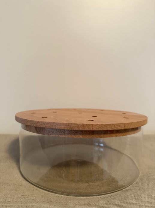 Spodnji del posode je steklen. Zgornji del lesen. Premer 25 cm, višina 10 cm. Posodi sta novi.
