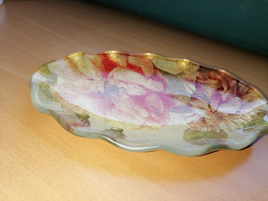 V notranjosti stekla je vzorčast,v zlati,zeleni,rdeči,rjavi barvi.Na nasprotni strani je zlate barve.Namenjen za dve,morda tri majhne skodelice kavice,tudi za pecivo ali preprosto za odlaganje stvari.Lahko vam služi kot lepa dekoracija.Odlično ohranjen.Njegove mere: premer po dolžini 20,8cm,premer po širini 13,4cm,višina 1,5cm.Tel.064 222 880,pošljem po navadni pošti ali osebni prevzem.