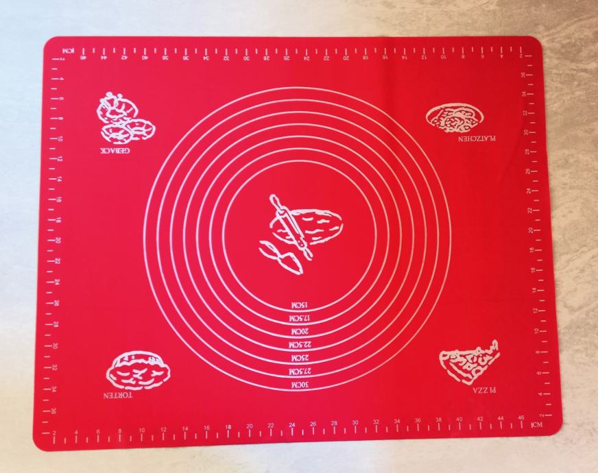 Prodam rdečo gumijasto podlogo za valjanje testa dimenzij 48 cm x 38 cm.