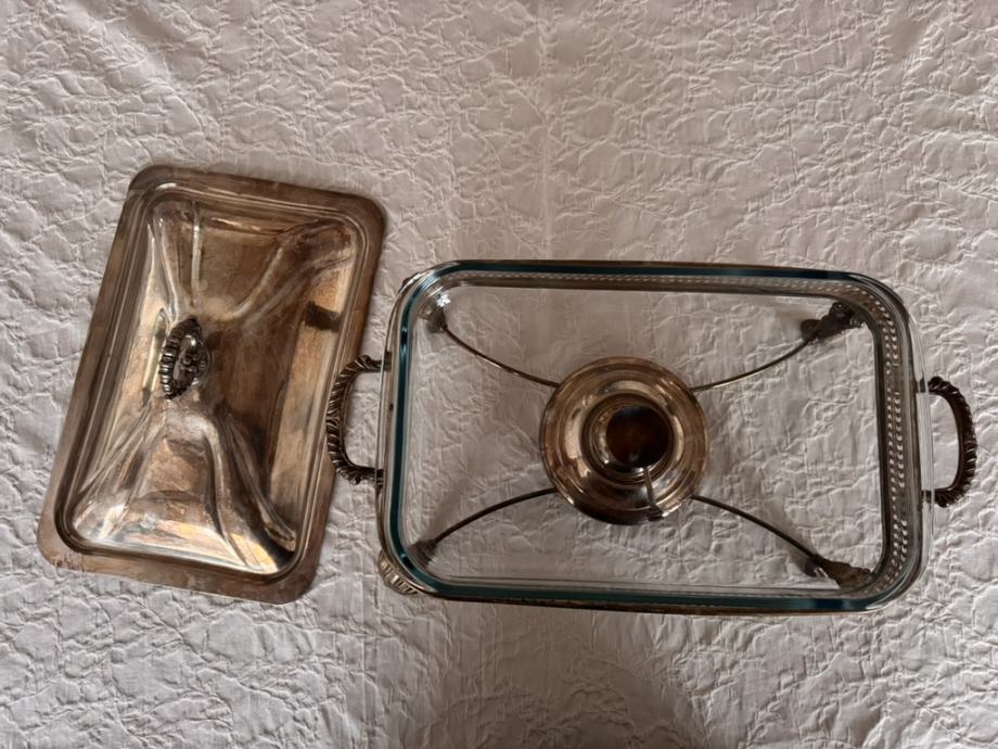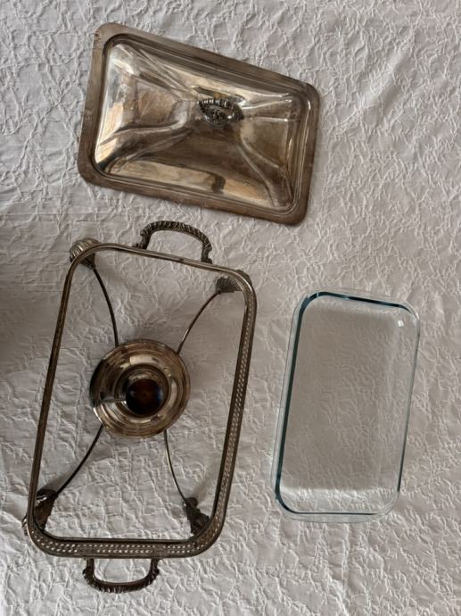 STEKLENA POSODA, SREBRNO STOJALO IN PODSTAVEK, GORILNIK NA ALKOHOL...