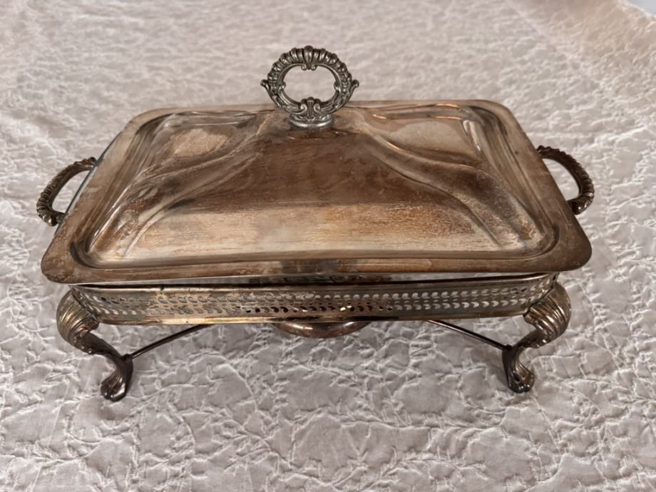 SERVIRNA POSODA STEKLENA S SREBRNIM STOJALOM IN POKROVOM