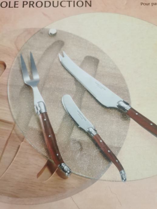 Še originalno zapakiran servirni krožnik za sir s pripadajočim priborom, ki se ga po uporabi praktično pospravi v notranjost krožnika.