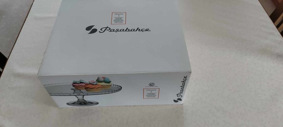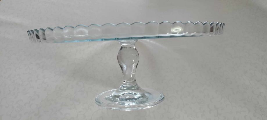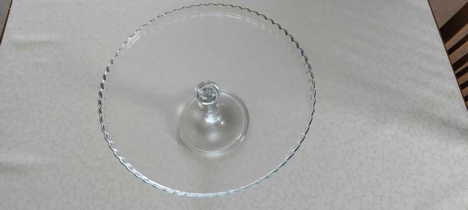Stekleno servirno stojalo oziroma podlaga za torto in ostala peciva v velikosti 32 cm premera. Nogica je visoka 11 cm in spodnji del 13cm premera. Novo, nerabljeno.