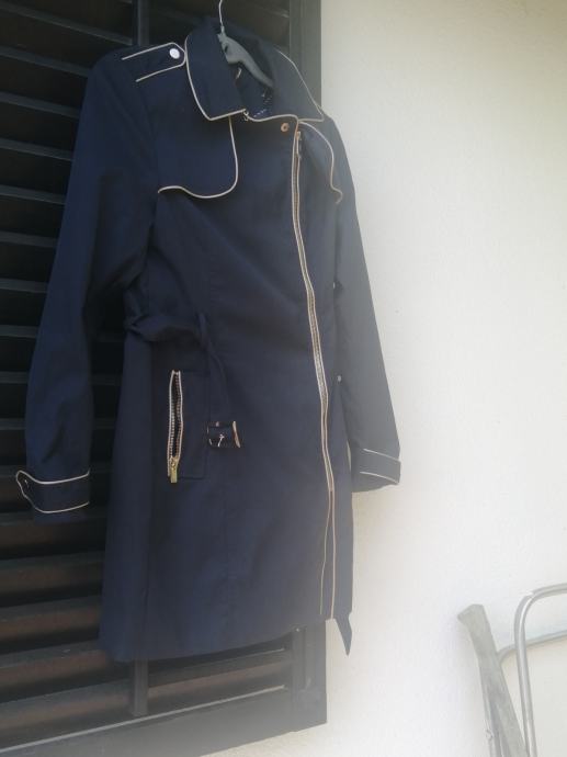 ženski plašč marx, (trench) številka M,( v bistvu je manjša številka glej mere) temno modre barve z obrobo, in zadrgami. v zlati barvi., kot nov
