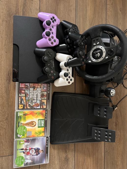 Prodajam rabljeno PlayStation 3 konzolo z dodatno opremo, vključno z brezžičnimi kontrolerji in volansko enoto. Priložene so tudi tri igre: GTA V, FIFA in FIFA Brazil 2014. Konzola je v dobrem stanju in popolnoma delujoča.