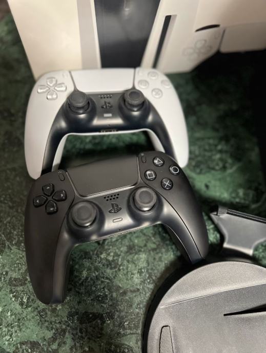 Priložena sta dva originalna DualSense kontrolerja – beli in črni. Na konzoli so nameščeni črni pokrovi (Midnight Black), originalni beli pa so prav tako vključeni.