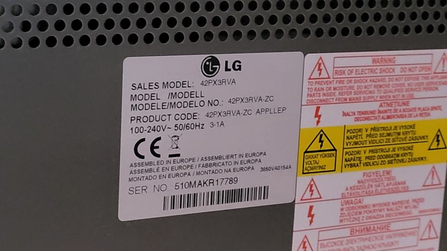 Prodam tv sprejemnik plazma LG 42PX3RVA, diagonala 107 cm, HDMI, s podstavkom in daljincem, brezhibna, lepo ohranjena, do nedavnega v uporabi. Cena 45,00 EUR. Tel.: 041/728-166.