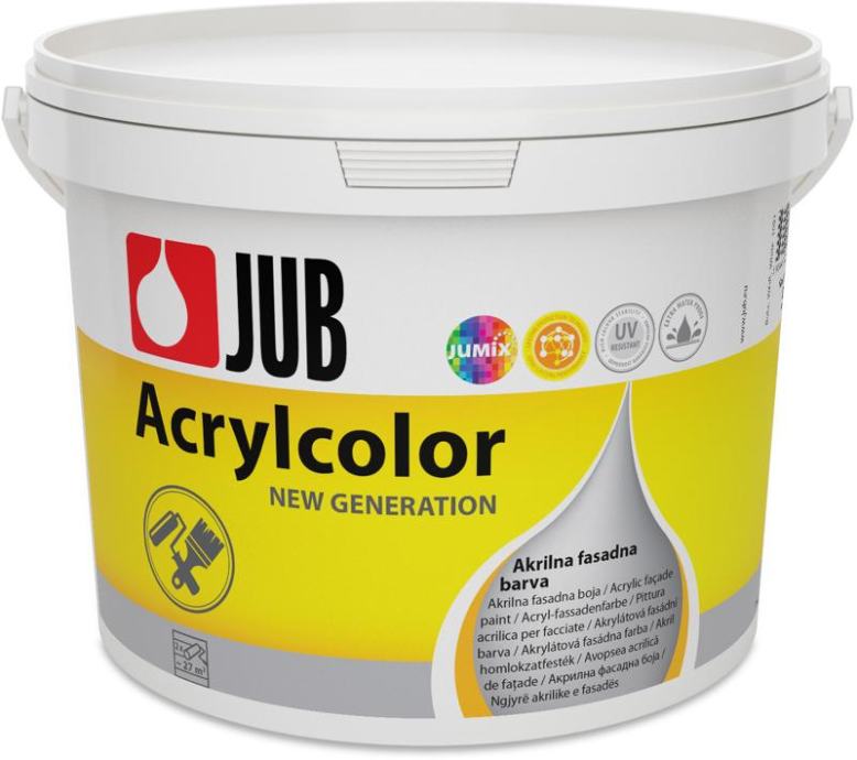 JUB Akrilna fasadna barva Acrylcolor je odlična izbira za manjše in večje objekte brez ali z minimalnimi napušči. Najpogostejša izbira za čvrste finoometane, zaglajene ali gladke fasadne površine. Najpogostejša izbira med fasadnimi barvami z odlično vodoodbojnostjo.Odporna na razvoj alg in plesni, z zelo dobro paroprepustnostjo in odpornostjo na vremenske obremenitve. Visoka elastičnost filma.