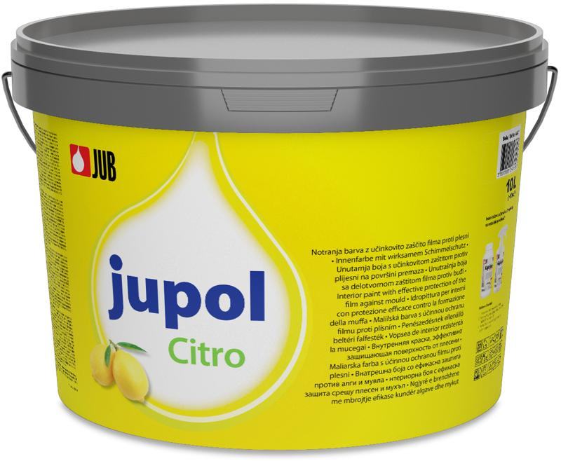 JUPOL CITRO je na osnovi vodne disperzije polimernih veziv izdelana notranja zidna barva, primerna predvsem za dekorativno zaščito sten in stropov v prostorih, v katerih zaradi visoke relativne vlažnosti zraka obstaja velika verjetnost pojava kondenza, zaradi tega pa v kotih, za omarami in drugje velika verjetnost za intenziven razvoj različnih vrst zidnih plesni. Priporočamo jo predvsem za kuhinje, kopalnice in druge sanitarne prostore, pralnice, shrambe, in podobne prostore v stanovanjskih in poslovnih zgradbah, šolah, vrtcih, bolnišnicah, hotelih, domovih za starostnike in drugih javnih, obrtnih in industrijskih objektih, v katerih za dekorativno obdelavo zidnih in stropnih površin ni zahtevana uporaba pralnih barv oziroma barv odpornih na mokro drgnenje. Primerne podlage so fini ometi vseh vrst, z izravnalnimi masami zglajene površine, papirnate reliefne tapete, pa tudi mavčnokartonske in vlaknenocementne plošče, iverice, neometan beton, ipd. Možen je tudi nanos na dobro oprijete stare disperzijske premaze in dobro oprijete dekorativne omete vseh vrst.JUPOL CITRO odlikuje izjemno nizka vsebnost lahko hlapnih organskih snovi, ne vsebuje težkih kovin. V času nanašanja in sušenja ima prijeten vonj po limoni. Barva je enostavna za nanašanje in na voljo v široki paleti pastelnih barvnih odtenkov.