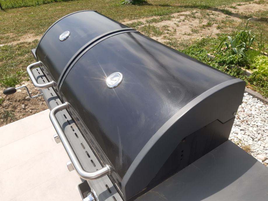 Žar je na kolesih in ima 3 plinske gorilnike, termometer, 2 odlagalni polički, rešetko za ohranjanje toplote, možnost indirektne peke, dodaten predal,...